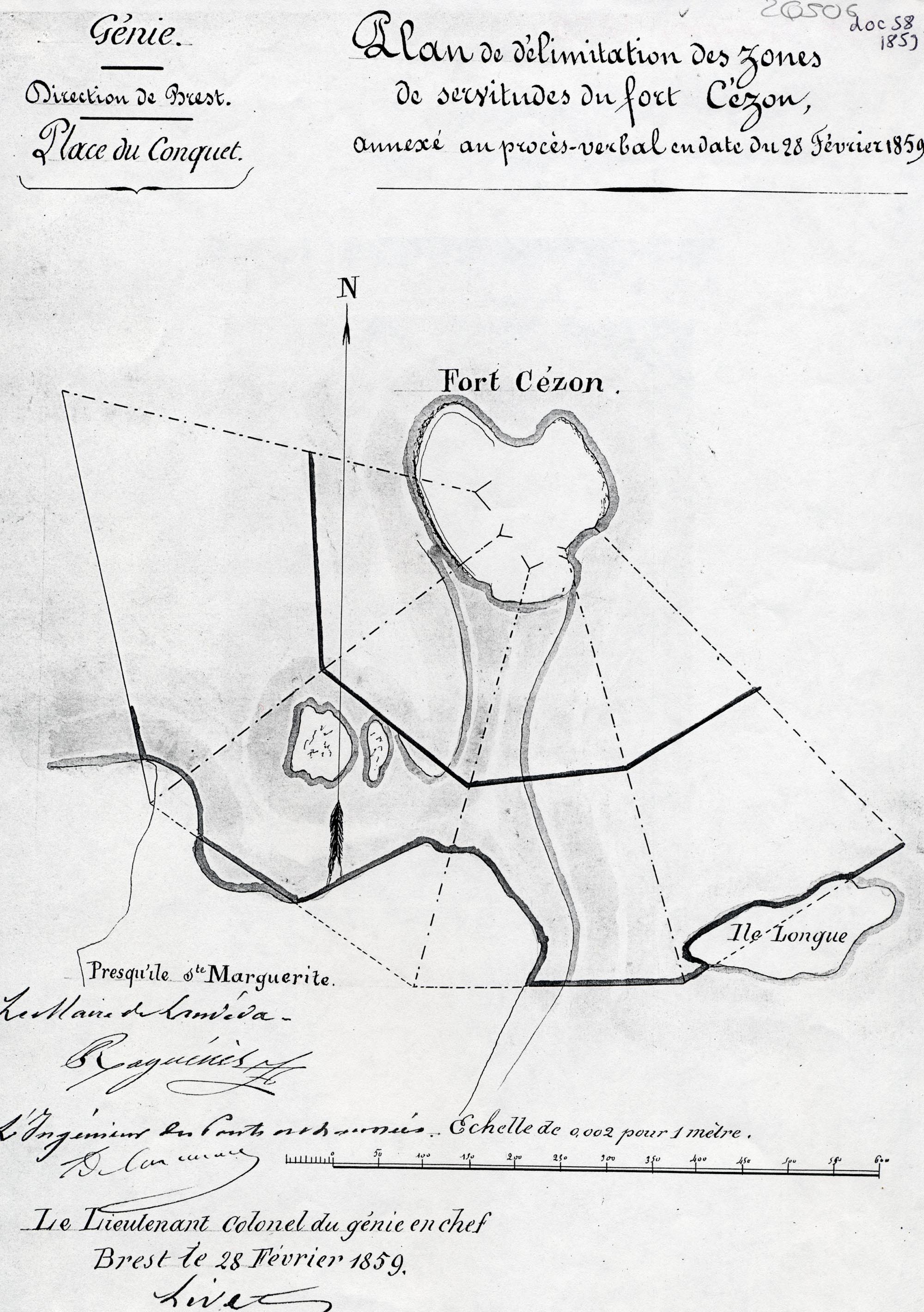 Plan de délimitation des zones de servitude du fort Cézon, 1859, Archives départementales du Finistère, Quimper, 2Q 506 (association Cézon, document n° 58)Immatriculation