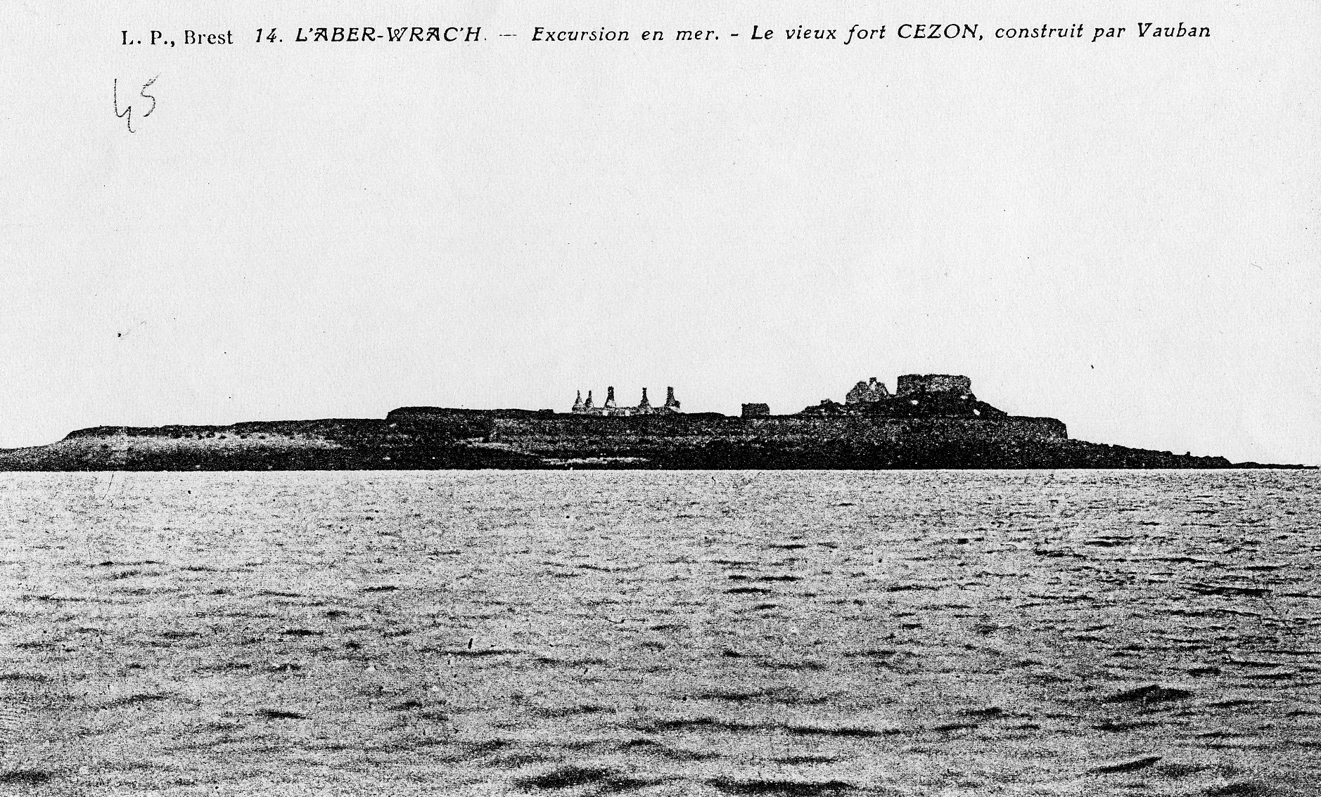Landéda : fort Cézon, ancienne carte postale, début du 20e siècle (collection Association Cézon). On peut notamment distinguer les pignons des casernesImmatriculation