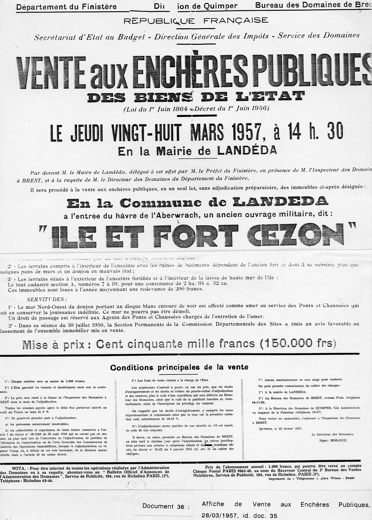 Affiche de la vente aux enchères publiques de l'île et fort Cézon, 1957 (collection association Cézon)Immatriculation