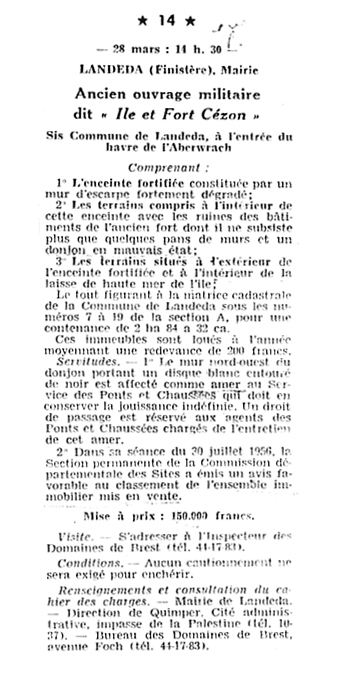 Revue de presse sur l'achat du fort Cézon par Yves Le Nestour (collection association Cézon)Immatriculation