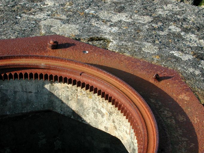Landéda, île Cézon : Tobrouk pour tourelle de char, support octogonale de la tourelle, détail du dentelage...Immatriculation
