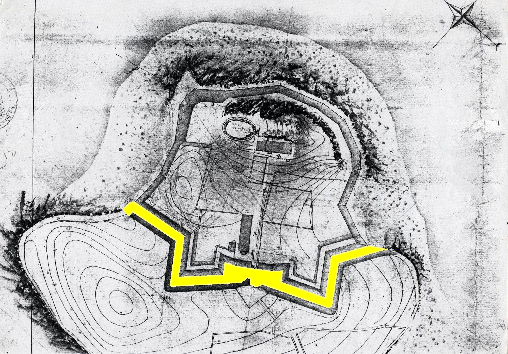 Fossé (en jaune) du fort Cézon avec courbes de niveaux, 1857, Service Historique de la Marine, Brest, ZD269Immatriculation