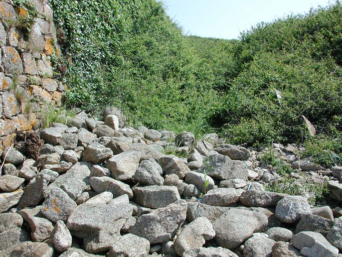 Vue du détail de l'entrée du fossé côté large. Pierres provenant du déroctage des fosses des bunkersImmatriculation