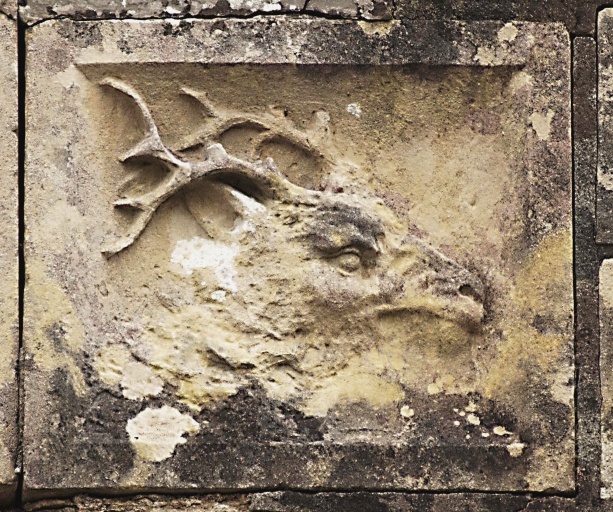 Façade d'entrée, bas-relief, tête de cerfImmatriculation