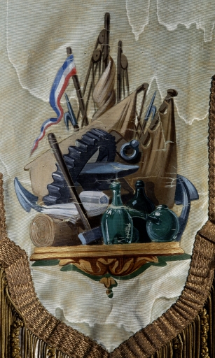 Bannière, détail du décor latéral droit : outilsImmatriculation