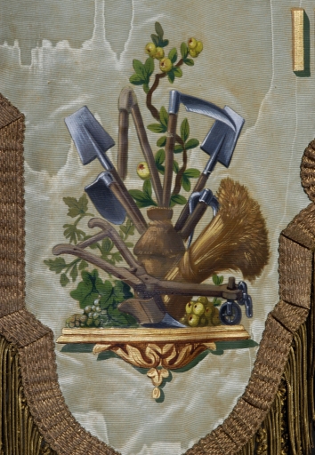 Bannière, détail du décor latéral gauche : outils agricolesImmatriculation