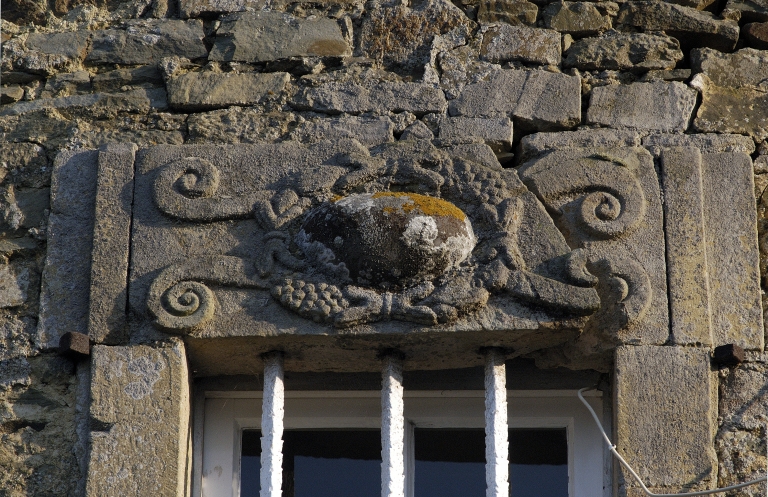 Pierre remployée en linteau : cabochon et cuirs enroulésImmatriculation
