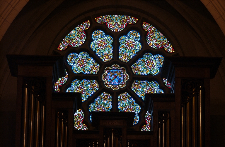 Ensemble de 7 verrières décoratives ou à personnages du choeur (baies 0, 1 à 6) : Sacré Coeur, Saint Martin, Saint Michel, et rose occidentale,