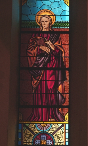 Ensemble de 6 verrières à personnages des chapelles latérales (baies 7 à 12) : Notre-Dame de Lourdes, Sainte Thérèse d'Avila, Sainte Bernadette, Sainte Thérèse de l'Enfant-Jésus, Saint Jean, Sainte Elisabeth de Hongrie,