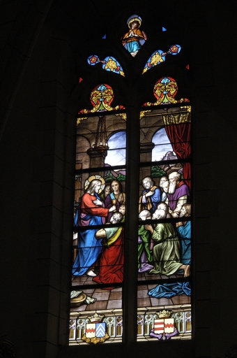 Verrière de la baie 102 : Le Christ communie les apôtres. Armes d'alliance d'Alain Léon de Tréverret et Edith de Parcevaux. Armes d'alliance de Nathalie Léon de Tréverret et Léon de CarnéImmatriculation