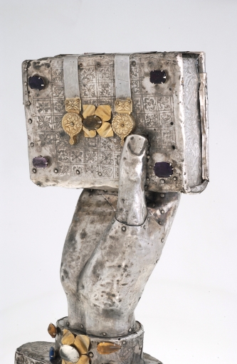 Bras-reliquaire : détail main et livre, de trois-quartsImmatriculation
