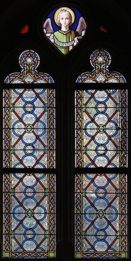 Ensemble des verrières à personnages des baies 1 et 2 : Sacrés Coeurs de Jésus et de Marie, Saint Pierre, Saint Paul, et des verrières décoratives des baies 3 à 6,