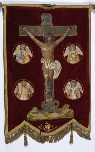 Bannière de procession : Vierge à l'Enfant, Christ en croix,