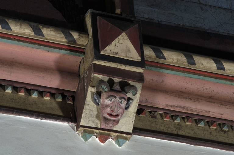 Décor de charpente : 5 entraits, lambris de couvrement, nervures de voûte, 14 sablières,