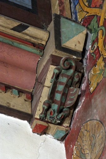 Décor de charpente : 5 entraits, lambris de couvrement, nervures de voûte, 14 sablières,