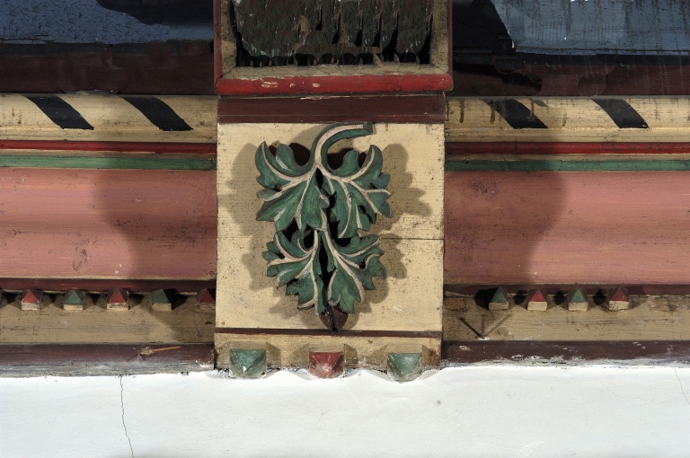 Décor de charpente : 5 entraits, lambris de couvrement, nervures de voûte, 14 sablières,