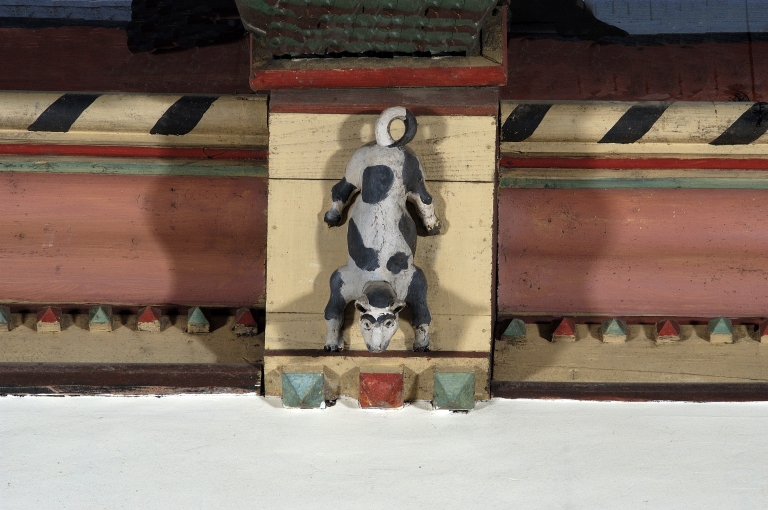 Décor de charpente : 5 entraits, lambris de couvrement, nervures de voûte, 14 sablières,