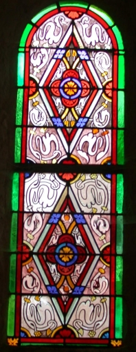 Ensemble de la verrière à personnages de la baie 0 : Immaculée Conception et des 6 verrières décoratives des baies 1 à 5 et 00,