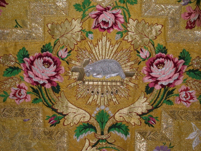 Ornement doré 1 : chasuble, bourse de corporal, 2 étoles, manipule, voile de calice,