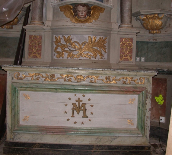 Ensemble de l'autel de la Vierge : autel, tabernacle, retable, 2 degrés d'autel,