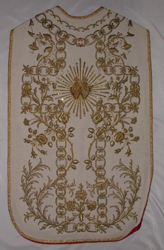 Ornement blanc 1 : chasuble, bourse de corporal, étole, manipule, voile de calice,