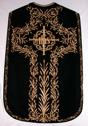 Ornement noir 1 : chasuble, étole, manipule, voile de calice,