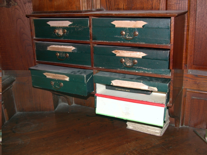 Bureau du prêtre : détail des classeurs en cartonImmatriculation