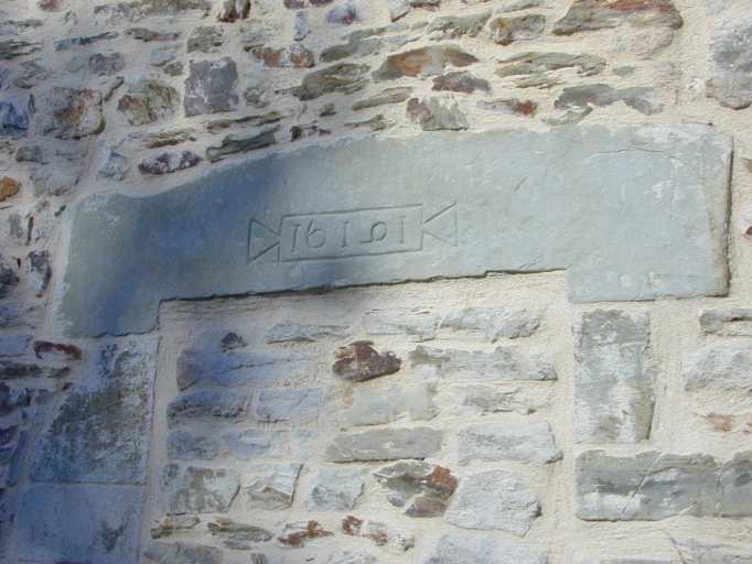 Façade antérieure, linteau de fenêtre bouchée gravé d'une date : détailImmatriculation