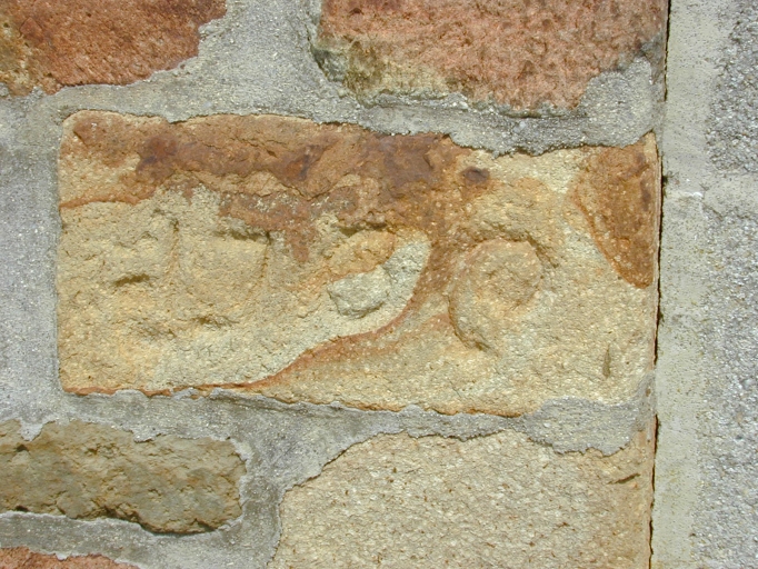 Façade antérieure, date de remaniement gravée sur le logis : détailImmatriculation