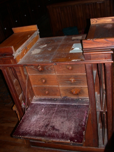 Ensemble de meubles de sacristie : chasublier, bureau, 30 armoires de sacristie,