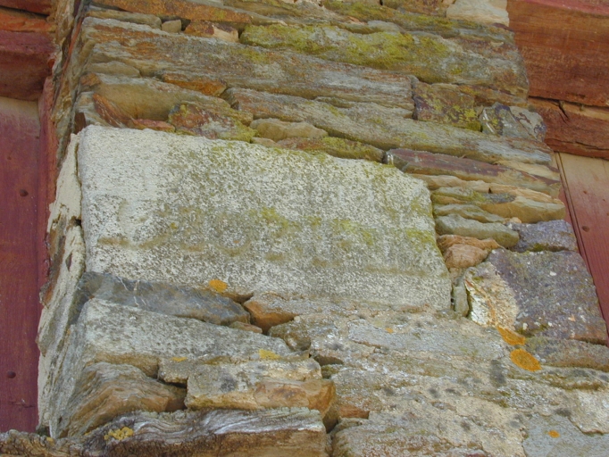 Logis, façade antérieure, pierre gravée d'inscritions enchâssée entre les deux gerbières : détailImmatriculation