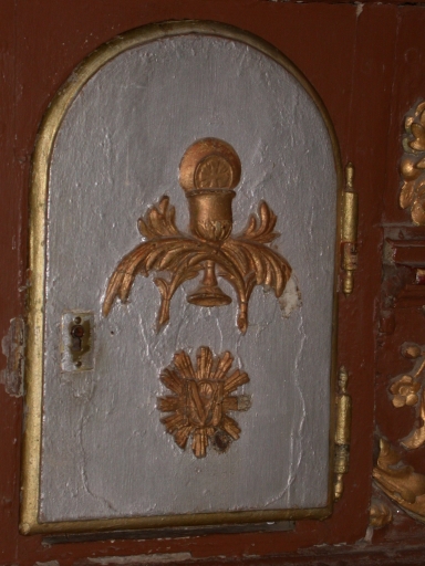 Tabernacle : décor de la porte : calice, hostie et palmesImmatriculation