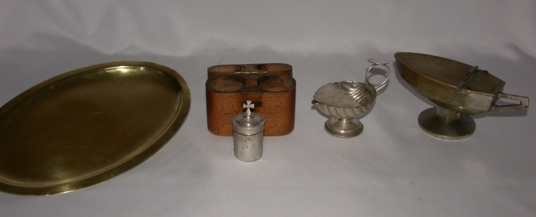 Plateau de communion, paire d'ampoules aux saintes huiles, coquille de baptême, navette à encensImmatriculation