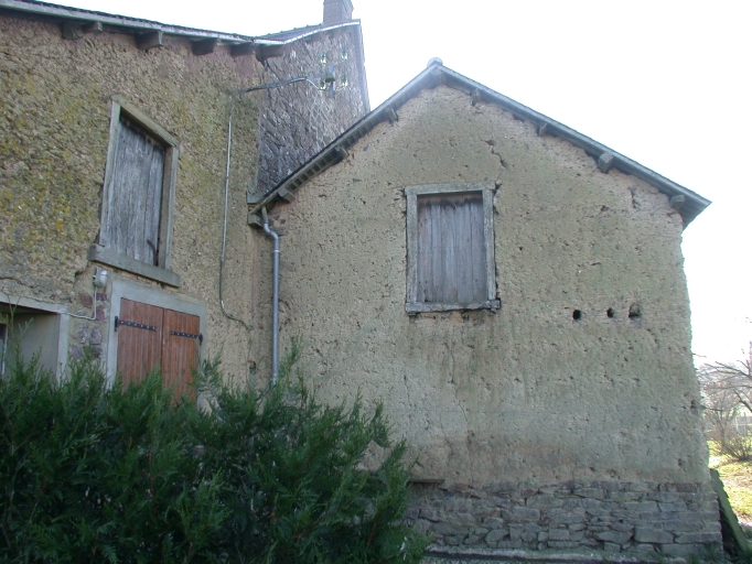 Détail de la façade arrière : moellons de schiste pour le pignon du logis, terre et solin de schiste pour la grange et le cellierImmatriculation