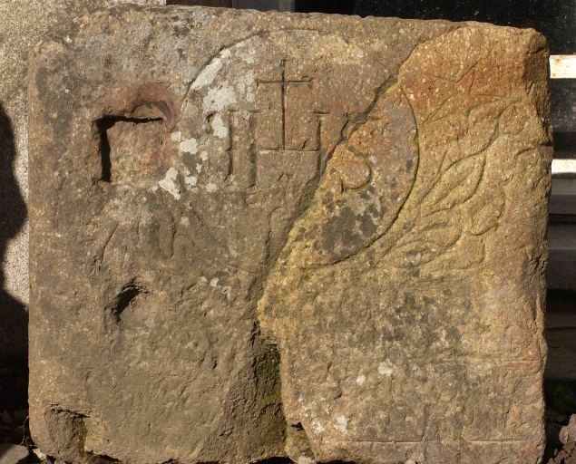 Pierre remployée et gravée du monogramme IHS, provenant de la maison d'en faceImmatriculation
