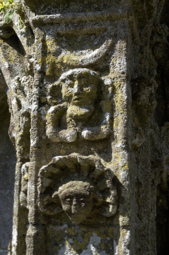 Détail des sculptures de pilastres.Immatriculation