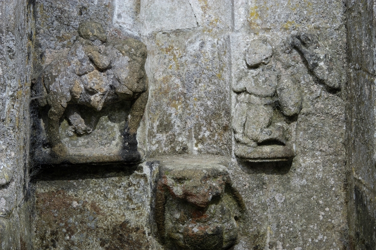Détail des donateurs, cavalier et paysan sculptés dans une des niches.Immatriculation