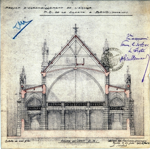 Dessin de Caubert de Cléry, coupe transversale de la nouvelle nef,1923-1924 (A.D. 56, série 2O 10/6, 8)Immatriculation