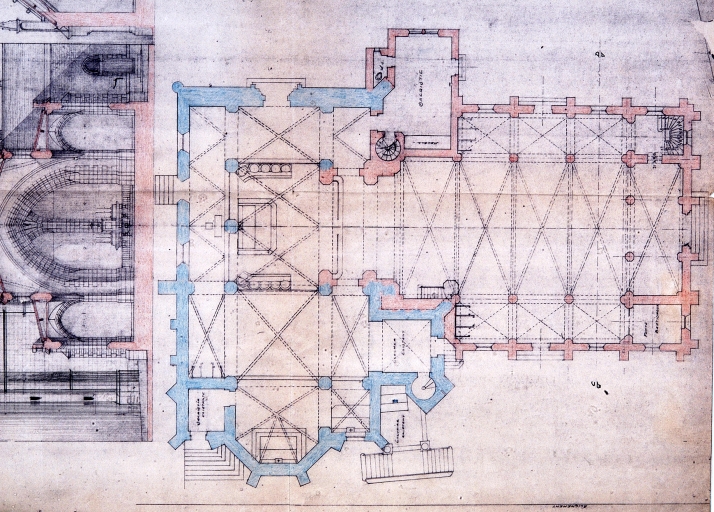 Dessin de Caubert de Cléry, plan au sol de la chapelle Notre-Dame de la Clarté et de la nouvelle nef, 1911 (A.D. 56, série 2O 10/6, 8)Immatriculation