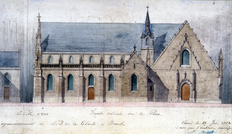 Dessin de Caubert de Cléry, projet d'agrandissement de la chapelle : élévation ouest sur la place,1923 (A.D. 56, série 2O 10/6, 8)Immatriculation