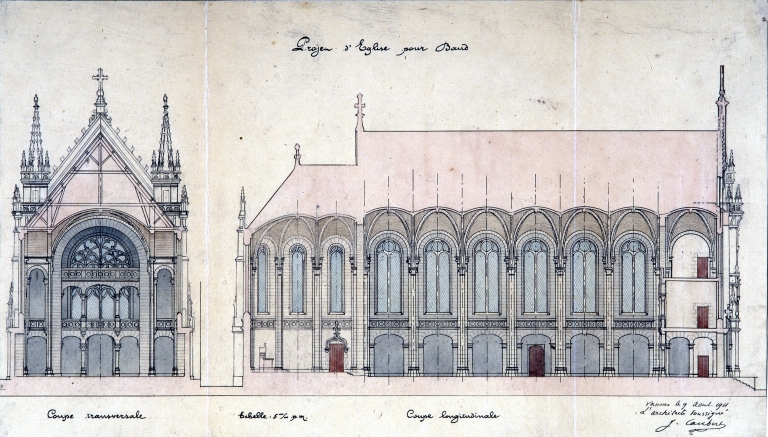 Dessin de Caubert de Cléry, 1er projet pour la nouvelle église : coupes transversale et longitudinale, 1911 (A.D. 56, série 2O 10/6, 8)Immatriculation
