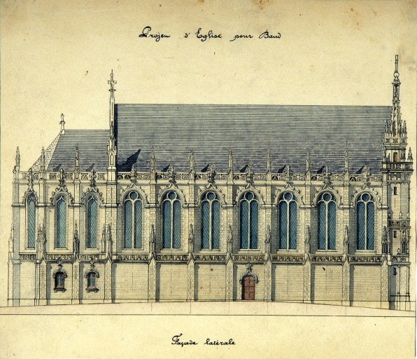 Dessin de Caubert de Cléry, projet d'église pour Baud : élévation est,1923 (?) (A.D. 56, série 2O 10/6, 8)Immatriculation