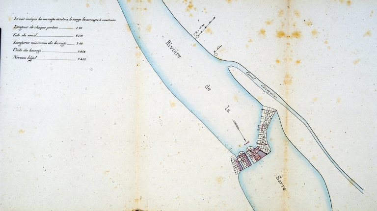 Melrand, barrage et pêcherie sur la Sarre, plan de 1859, détail (AD Morbihan, série S 1100).Immatriculation