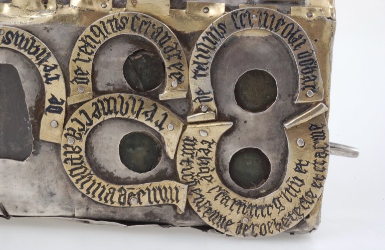 Châsse-reliquaire : détail, inscriptions des phylactères, partie droiteImmatriculation