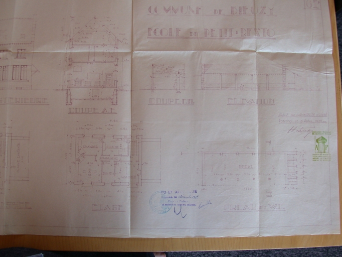 Extension de l'école du Resto : avant-projet. Coupes, plan de l'étage, plan et coupe du préau, par l'architecte Henry Le Cadre, 1936 (Doc. A. D. Morbihan)Immatriculation