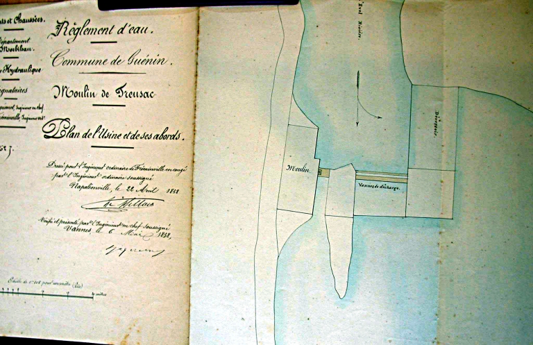 Moulin de Treusac'h. Projet de règlement d'eau : plans de l'usine et de ses abords, 22 avril 1858 (AD Morbihan, S 1062)Immatriculation