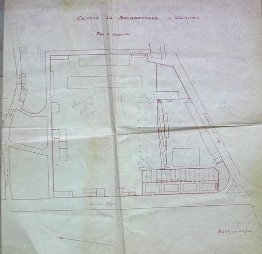 Plan d'ensemble de la caserne de La Bourdonnaye vers 1950. AM Vannes 5M204.Immatriculation