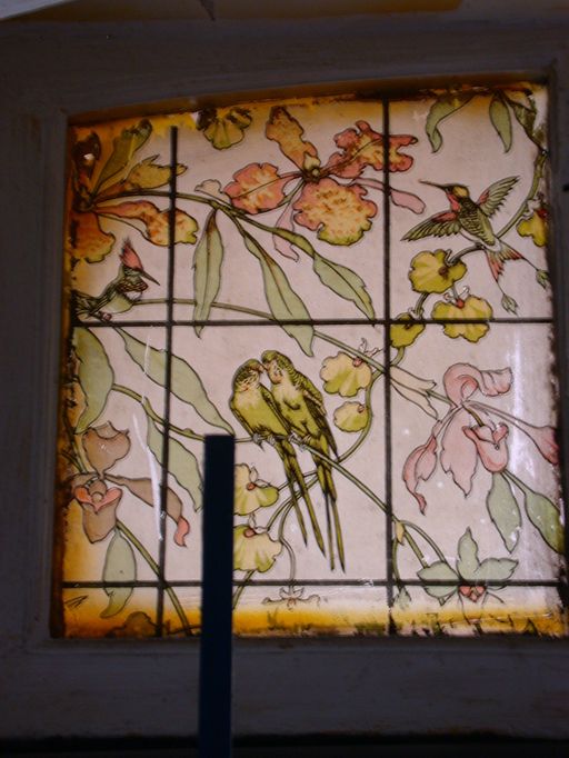 Vue du vitrail en imposte de la porte de la cour.Immatriculation