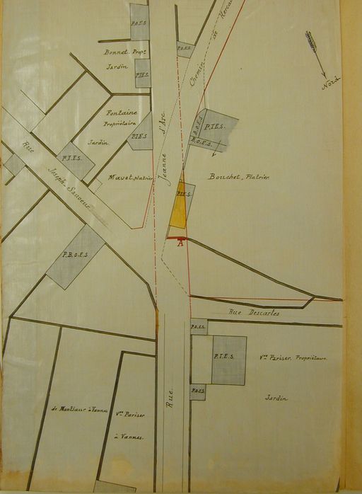 Plan d'une partie de la rue Jeanne d'Arc (jonction des rues Descartes et Sauveur) dressé à propos d'un litige concernant la maison Bouchet (n°30), 1919. AM Vannes.Immatriculation