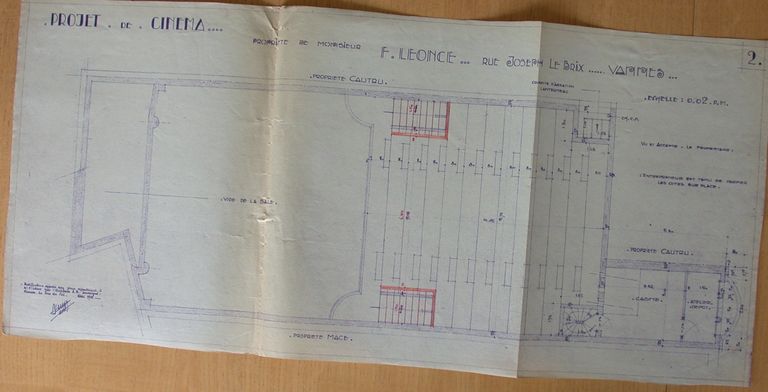 Projet de cinéma par Perrin, 1935 : plan du balcon. AD Morbihan 2 O 260/18.Immatriculation